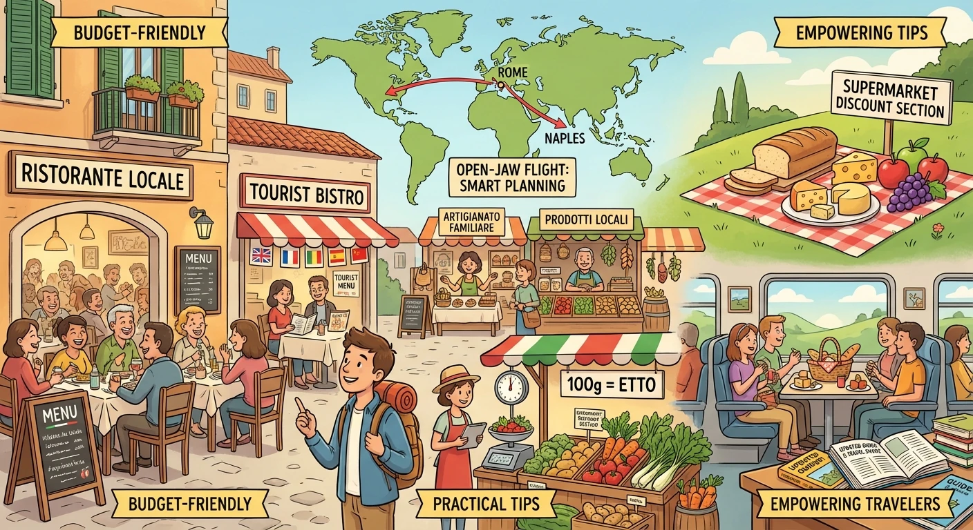 - سفرهای پیکنیکی هزینۀ زیادی را برای شما ذخیره میکند. با ده دلار در هر جای اروپا میتوان برای دو نفر ناهار پیکنیکی عالی تهیه کرد. اتاق هتل را با نوشیدنی و خوراکی در همان ابتدای ورود پر کنید. سفرهای قطار با یک وعدهٔ پیکنیکی لذتبخشتر میشود. در بسیاری از فروشگاههای زنجیرهای، بخشهایی مربوط به غذاهای ارزان وجود دارد. همچنین برای خرید میوه و سبزیجات، باید با سیستم اندازهگیری متریک نیز آشنایی داشته باشید. بهعنوان مثال در ایتالیا ۱۰۰ گرم (تقریباً یک چهارم پوند) یک واحد مستقل است که etto نام دارد.