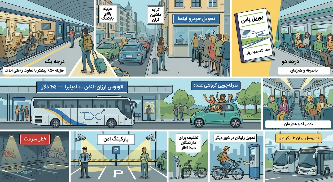 - اتوبوس، هرچند کندتر، از قطار ارزانتر است — مخصوصاً در بریتانیا که گرانترین سیستم ریلی اروپا را دارد. مثلاً سفر لندن تا ادینبرو ۱۴۵ دلار با قطار و ۴۵ دلار با اتوبوس است.