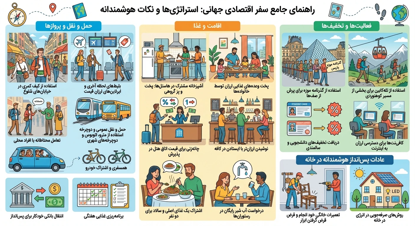 - در کنار پسانداز روزمره، میتوان از فرصتهای سفر هم بهره برد: سفر در فصلهای خلوت، استفاده از آفرهای لحظه آخری، تراولکارتها، اقامتهای ارزانتر مثل هاستل یا Airbnb و انتخاب حملونقل مناسب. کنار گذاشتن پول در یک حساب جداگانه نیز موجب میشود بدون فکر کردن، هر ماه بخشی از مبلغ موردنیاز ذخیره شود.